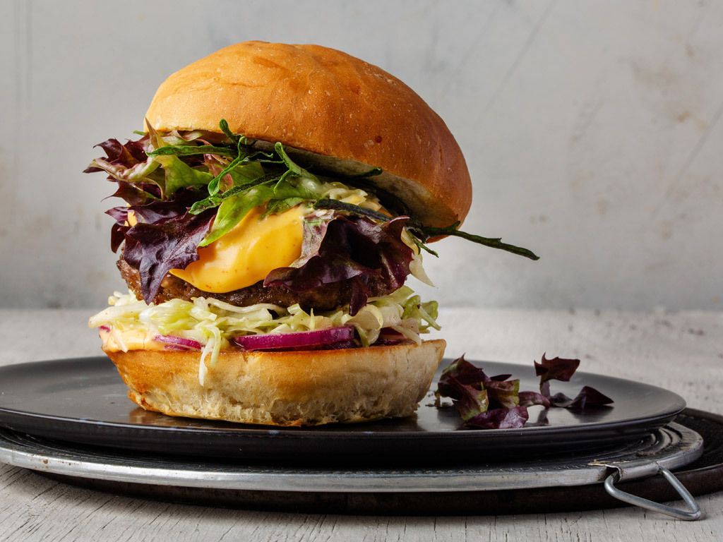 Kokoa hampurilaiset lisäämällä pohjan päälle punasipulia, coleslaw-salaattia, burgerpihvi, cheddar-juusto, salaattia ja chilimajoneesia.