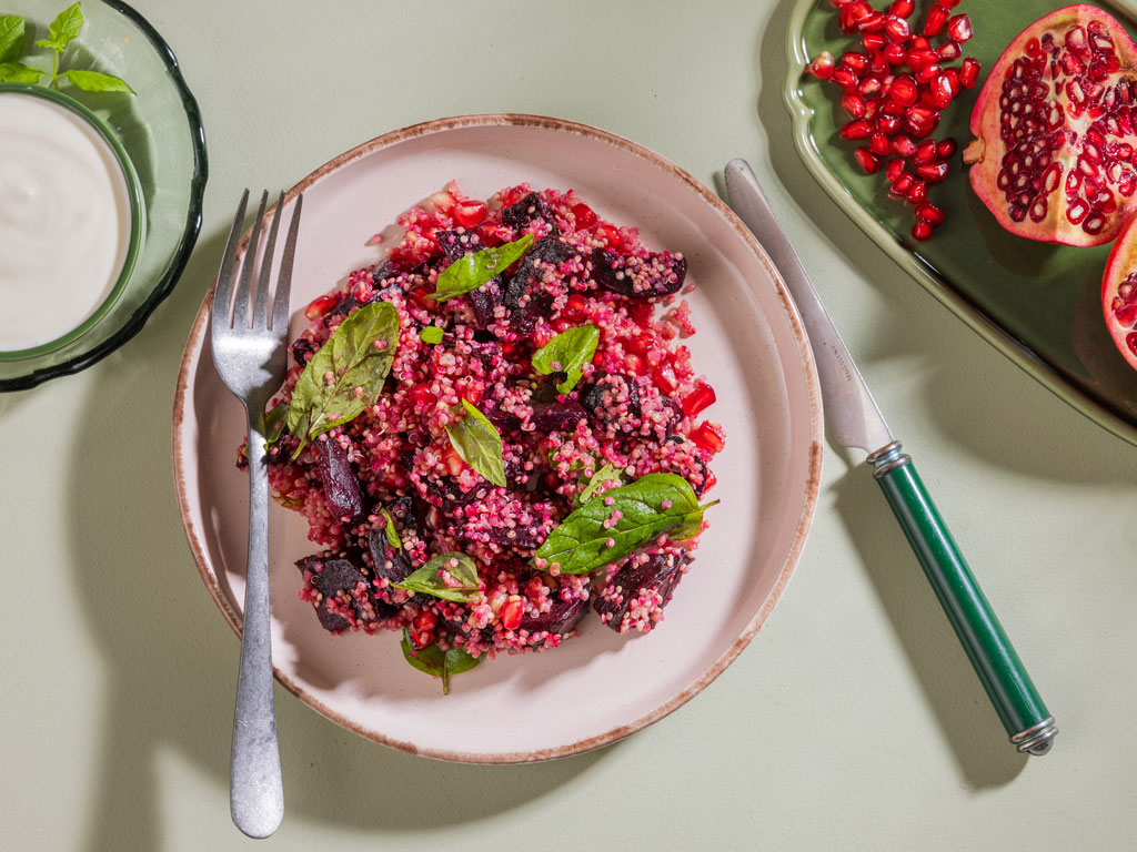 Raikas ja ruokaisa punajuurisalaatti valmistuu helposti ja nopeasti. Vegaanisen version saat vaihtamalla turkkilaisen jogurtin kaurajogurttiin. Halutessasi voit lisätä paahdettuja siemeniä tai fetajuustoa, jotka tuovat annokseen lisää makua ja rakennetta. Tämä salaatti toimii mainiosti niin arki- kuin juhlapöydässä.