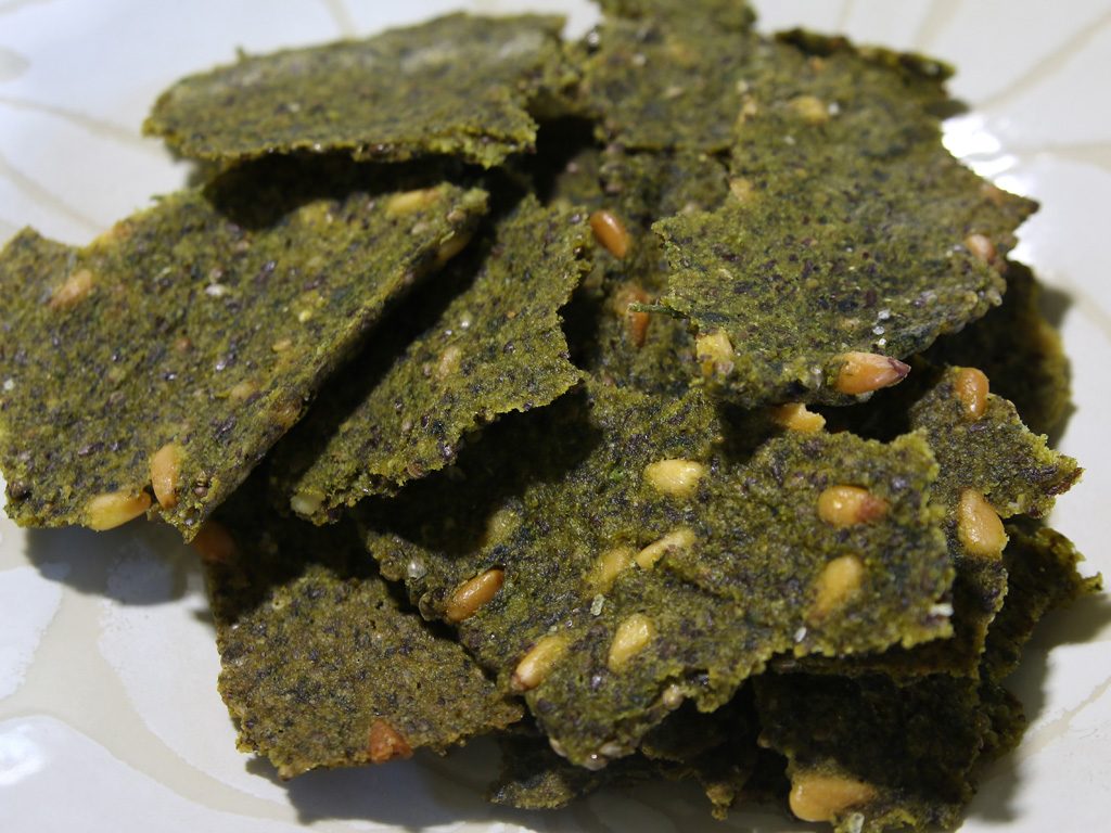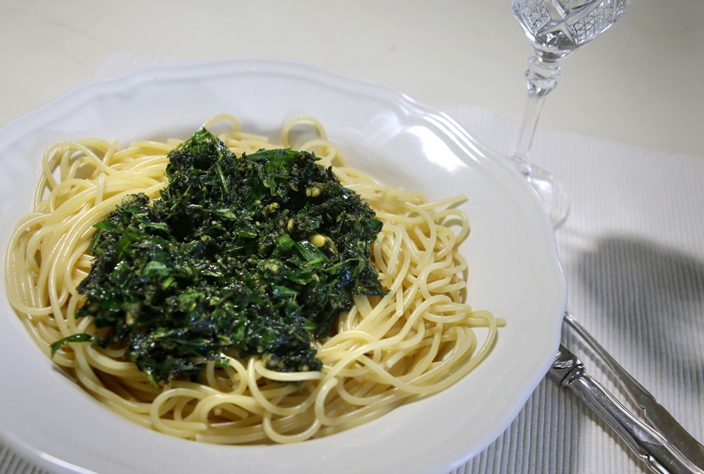 Leikkaa kasvit pieneksi silpuksi. Sekoita kaikki ainekset keskenään sauvasekoittimella, blenderissä tai morttelilla. Pinjansiemenet voit halutessasi korvata myös auringonkukansiemenillä.